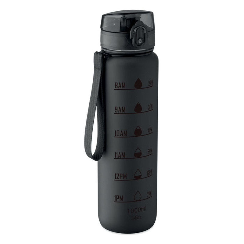 Urheilujuomapullo RPET-muovista, motivoivat aikamerkinnät, yhdellä kädellä avattava käännettävä kansi, turvalukko ja kantohihna. Vuotamaton. Tilavuus: 1 litra.