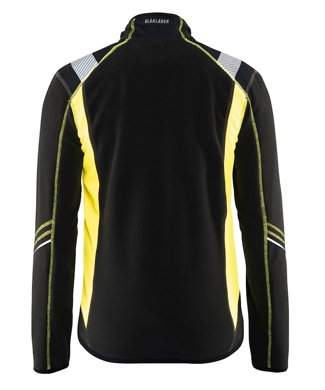 Nukkaantumista vastaan käsitelty microfleece, huomiovärisillä yksityiskohdilla parempaa näkyvyyttä varten. Fleecessä on heijastavia yksityiskohtia hihoissa, taskuissa ja hartioilla. Etutaskut vetoketjuilla ja kaksi taskua sisäpuolella. Selkäosa on pidennetty ja hihansuissa sekä helmassa on joustava reunus.