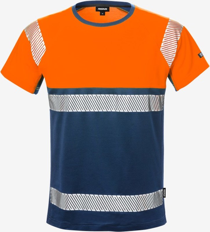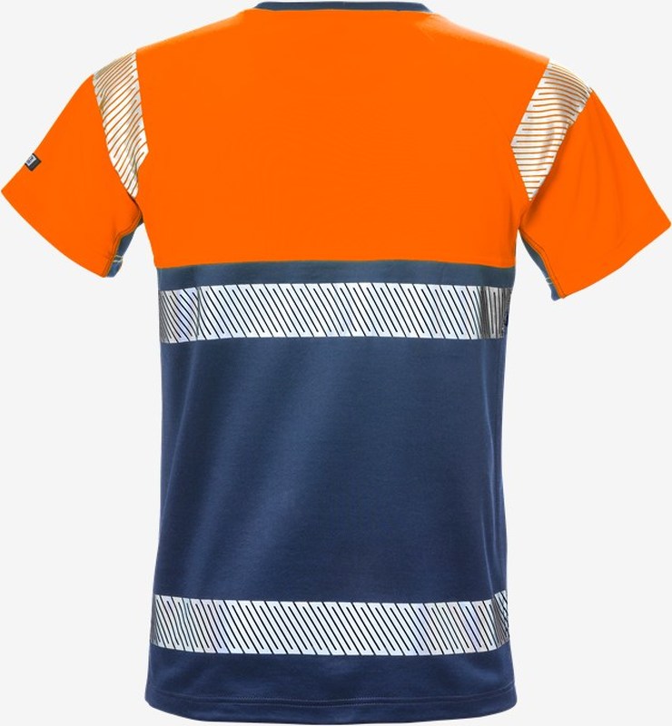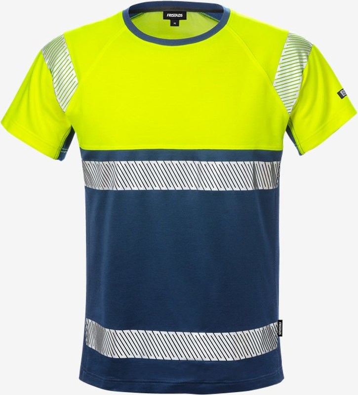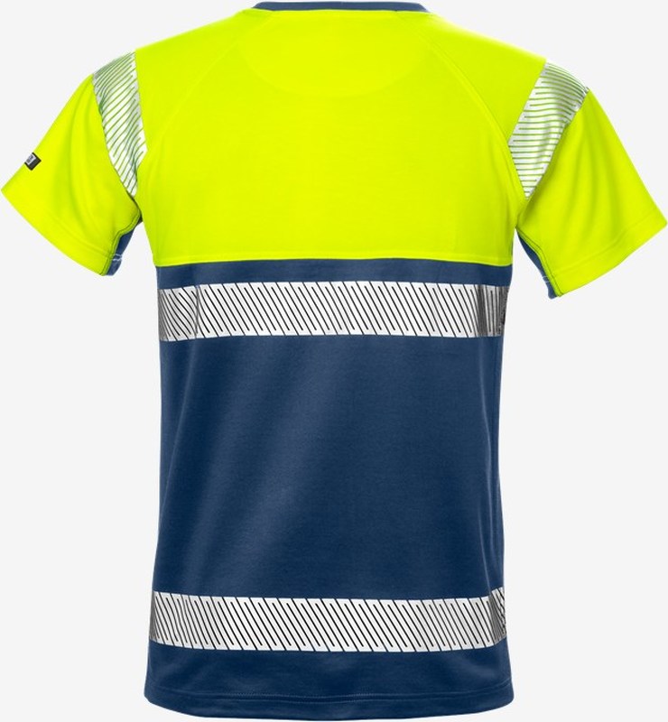 Näkyvä t-paita, jonka joustava heijastinnauha lisää liikkumavapautta. Valmistettu mukavasta ja pehmeästä materiaalista, jonka sisäpuoli puuvillaa. Siirtää kosteutta, kuivuu nopeasti ja suojaa UV-säteiltä. Väri 171 Neonkeltainen/Tummansininen on valmistettu puuvillasta ja kierrätetystä polyesteristä.