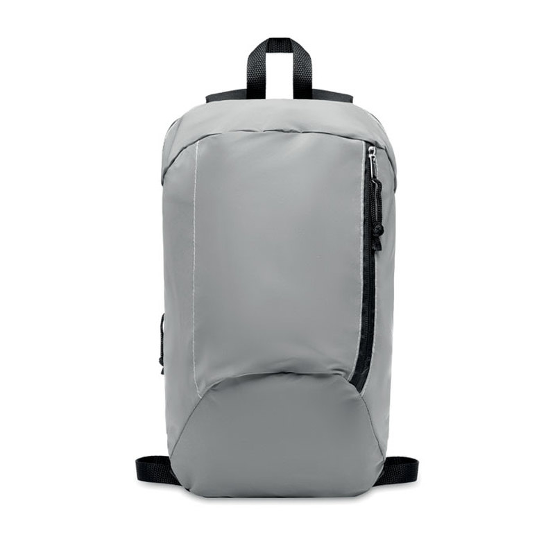 Heijastava reppu 600D polyesteristä. Repussa on vetoketjullinen päällitasku ja pehmustettu selkäosa.