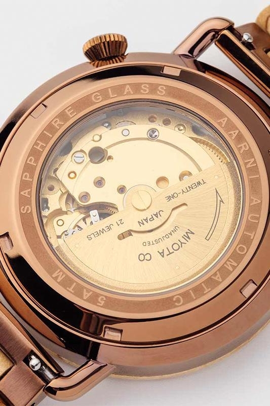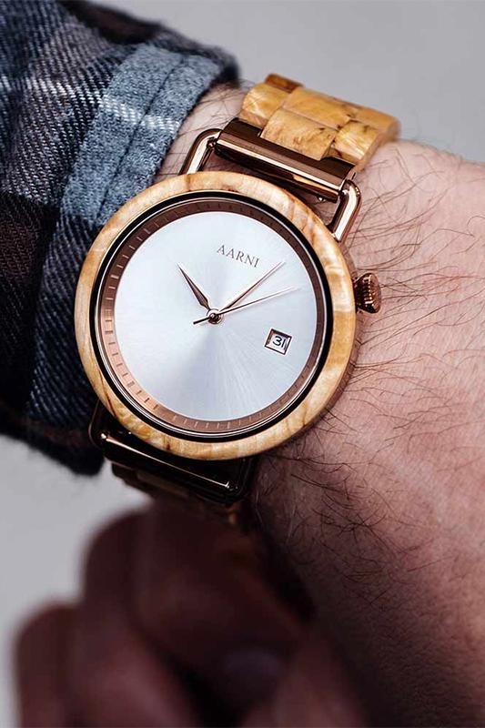 Ennennäkemätön kokonaisuus. Aarni Atlas on valmistettu marmorimaisesta visakoivusta ja se kätkee sisäänsä automaattikoneiston päivyritoiminnolla. Pronssinväriset yksityiskohdat ja metallinhohtoinen vaalea tausta vangitsevat katseen. Koneistoa ja heilurin liikettä voi ihailla takakannen safiirilasin läpi.