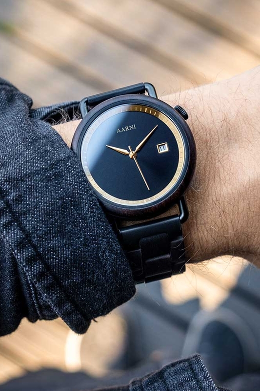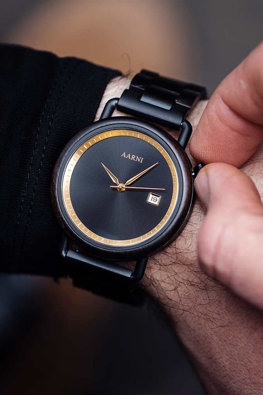 Tummanpuhuvaa lumoa. Aarni Atlas on valmistettu eebenpuun sydänosista ja se kätkee sisäänsä automaattikoneiston päivyritoiminnolla. Mattamusta runko ja kultaiset yksityiskohdat vangitsevat katseen. Koneistoa ja heilurin liikettä voi ihailla takakannen safiirilasin läpi.