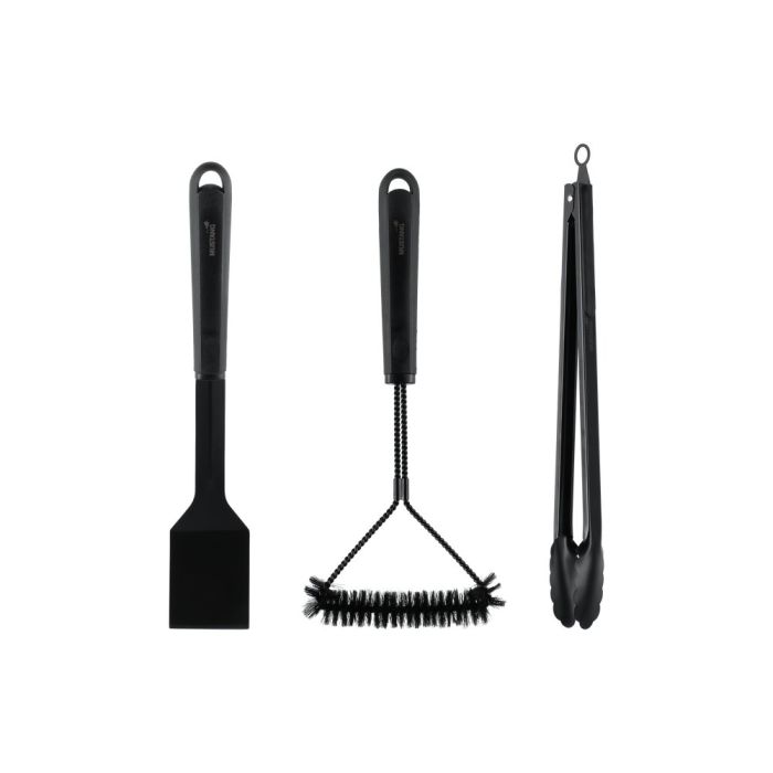 Ruostumattomasta teräksestä valmistetut laadukkaat grillausvälineet mustalla pinnoitteella. Setti sisältää lastan, pihdit ja puhdistusharjan.