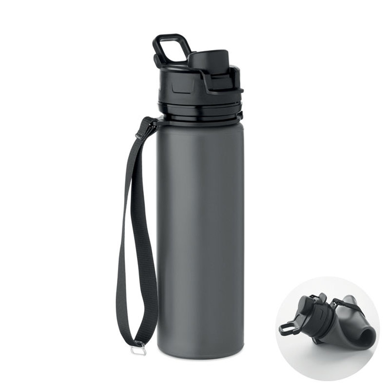 Kokoontaitettava silikoniurheilupullo, jossa on PP-kansi, kahva, polyesterihihna ja läpinäkyvä solki, joka kiinnittää pullon kokoontaitettuna. Vuotamaton. Tilavuus 500 ml.