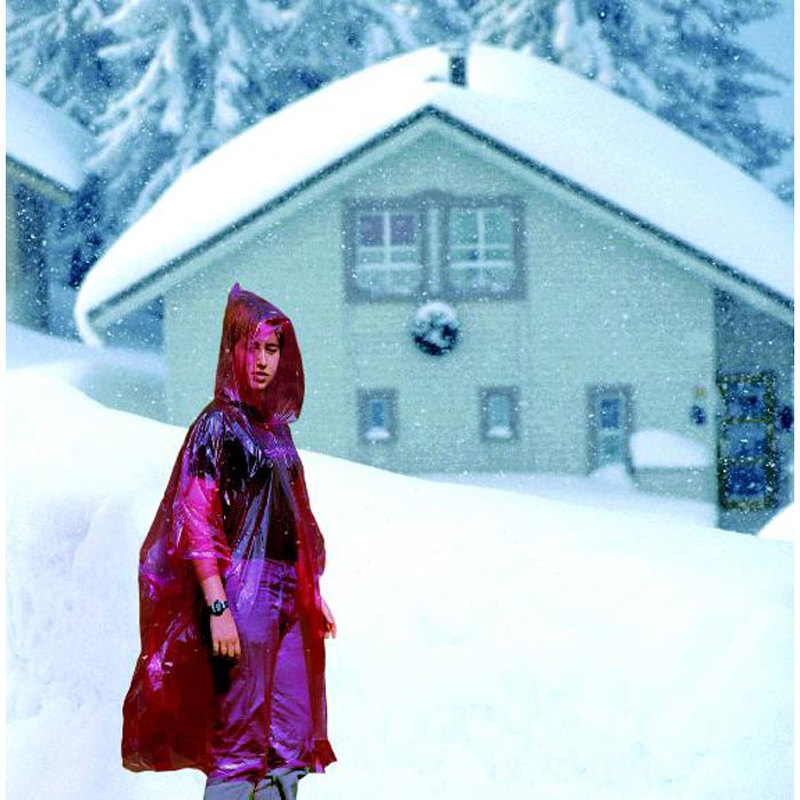 Taitettava sadeviitta hupulla, pakattuna läpinäkyvään polybagiin.