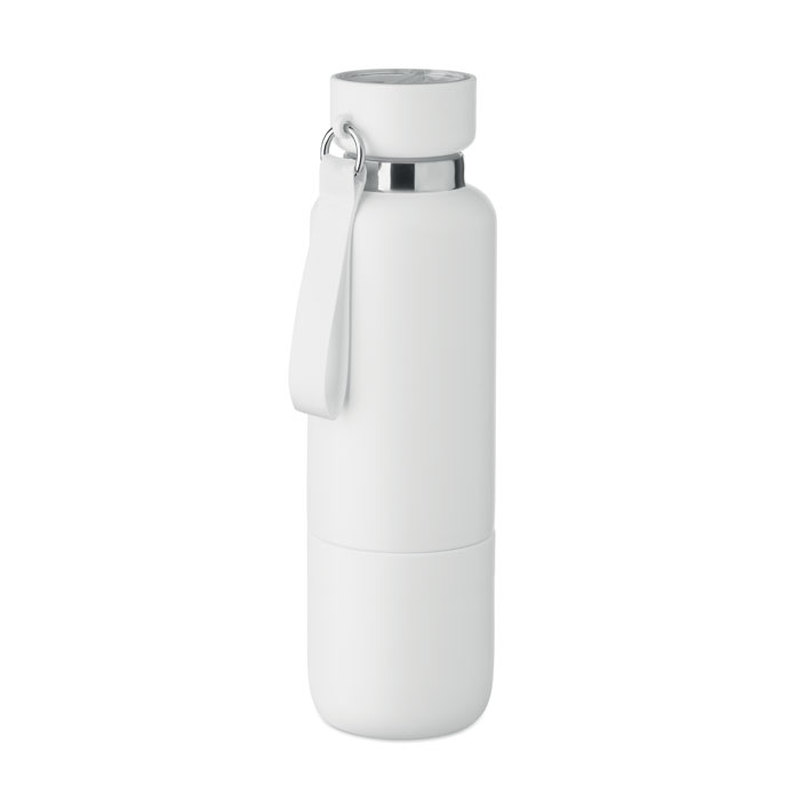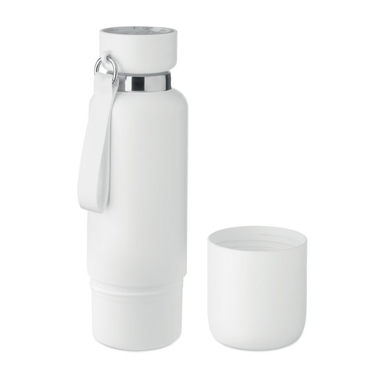 Kaksinkertainen eristetty pullo 90 % kierrätetystä ruostumattomasta teräksestä ja 10 % ruostumattomasta teräksestä, integroitu kahvahihna ja pitkä lisähihna (70 cm) PP-korkista. Vuotamaton. Muki sisältyy pakkaukseen. Tilavuus: 500 ml.