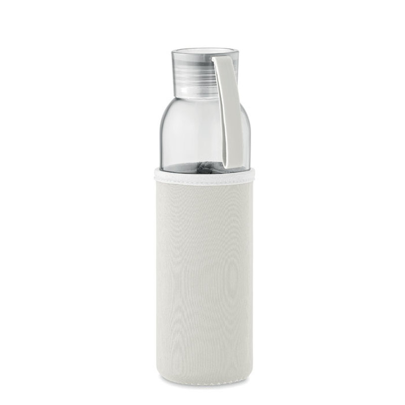 Kierrätyslasipullo, jossa neopreenipussi ja PP-korkki silikoniripustimella. Vuotamaton. Tilavuus: 500 ml.
