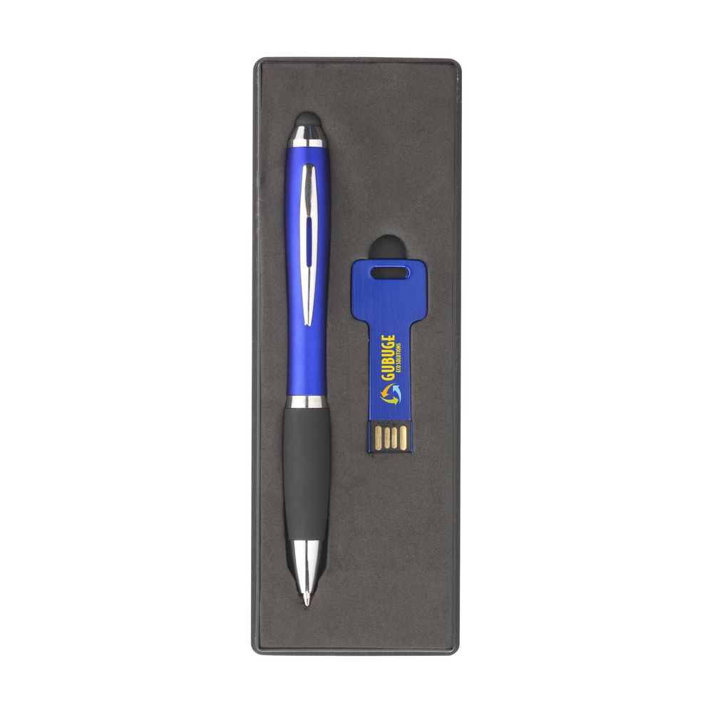 2-osainen lahjasetti: sisältää tyylikkään kuulakärkikynän kosketusnäyttö-kumipäällä, sinisellä musteella ja kierto-mekanismilla sekä metallinen USB-muistitikku 8GB muistilla.