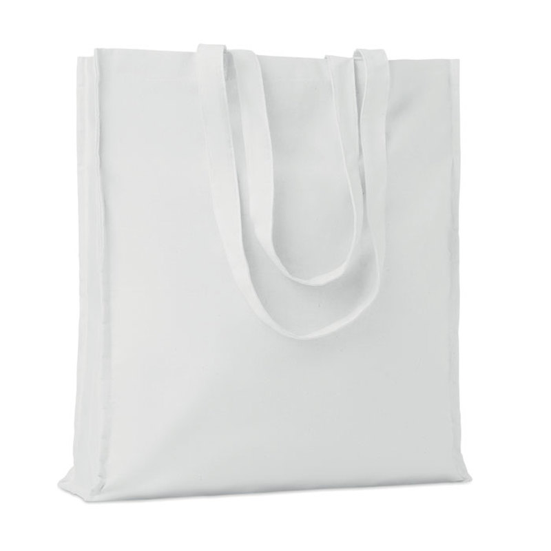 140 g/m² puuvilla kassi, pitkillä kahvoilla ja pohja levikkeellä. Valmistettu sertifioidun standardin mukaisesti haitallisten aineiden käytölle tekstiileissä.