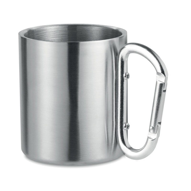 Kaksiseinäinen 220 ml ruostumattomasta teräksestä valmistettu muki, karabiinikoukulla.