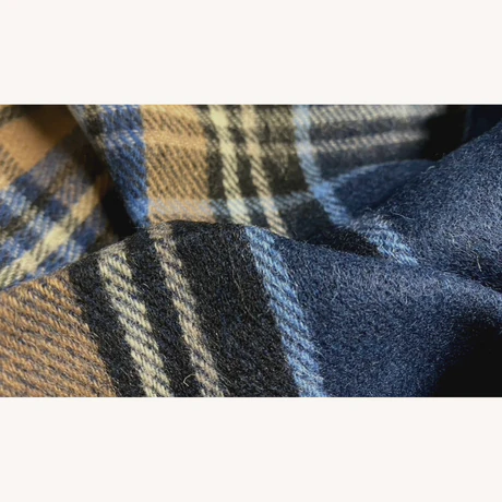 A blue and beige tartan pattern scarf in wool. An elegant and classic scarf that lasts for seasons and keeps you warm during autumn and winter.