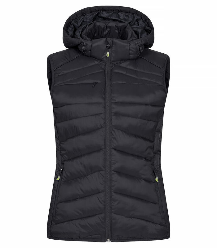 Lämmin mutta kevyt liivi untuvaa muistuttavalla toppauksella. Valmistettu kierrätetystä polyamidista. 3 vetoketjullista ulkotaskua ja 2 sisätaskua. Joustavat resorit vyötäröllä. Naisten mallissa on irrotettava huppu. Mukana värillinen ripustin, kätevä kuulokeratkaisu ja vetoketjun vedin.