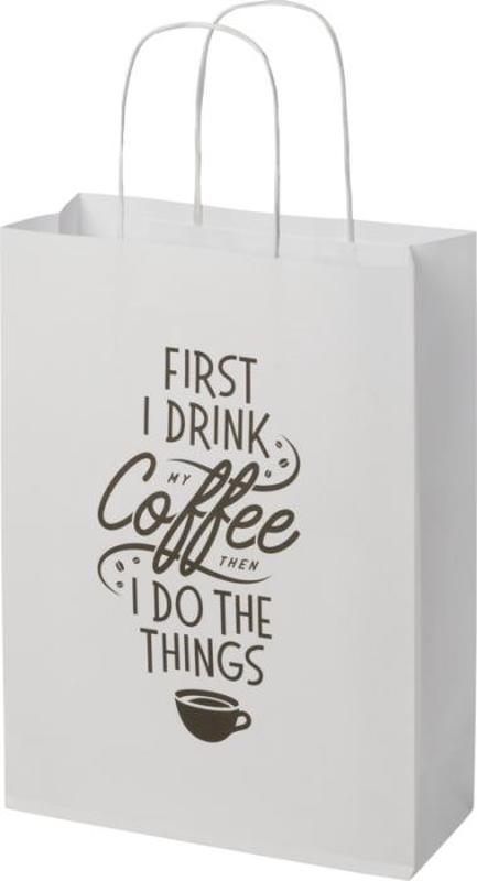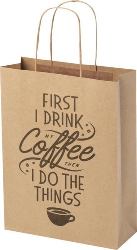 Keskikokoinen 120 g/m2-voimapaperikassi (24 x 9 x 32 cm) paperisilla kierrekahvoilla. Etu- ja takaosassa on runsaasti tilaa logon tai minkä tahansa muun kuvion painattamiseen, joten kassi sopii erinomaisesti markkinointiviestin välittämiseen. Euroopassa valmistettu ja 100-prosenttisesti kierrätettävä kassi on vastuullisempi valinta ympäristötietoisille yrityksille, jotka etsivät luontoa säästävää pakkausratkaisua. Kraft paper, 120 g/m2. FSC Mix Credit P5 CU-COC-877277.