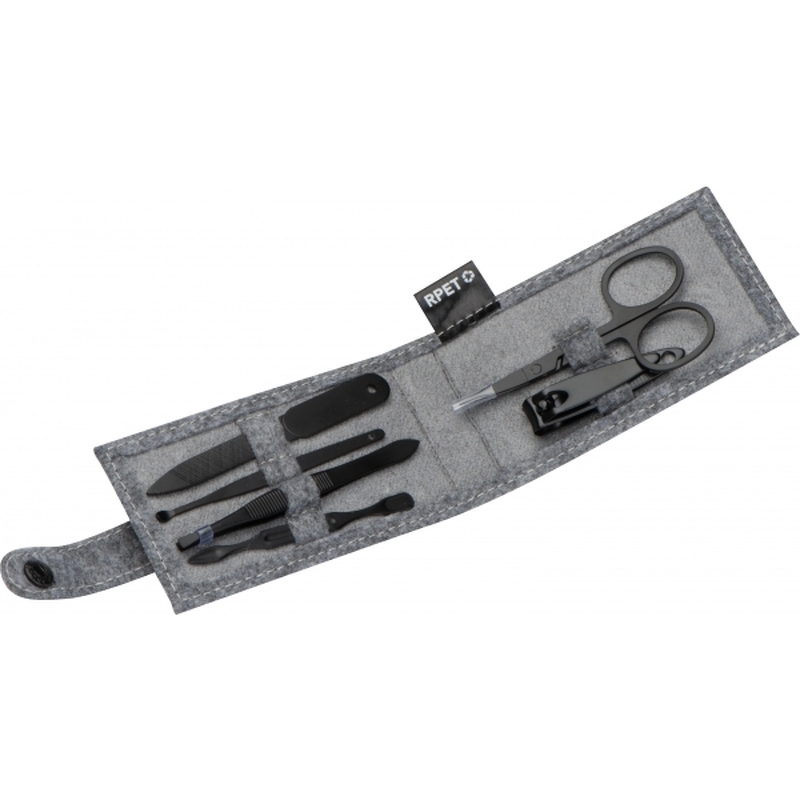 Houkutteleva manikyyrisetti huovasta (kierrätetty PET). Sisältää kynsisakset, kynsiviilan, kynsileikkurit, pinsetit ja kaksi kynsinauhojen työntölaitetta.