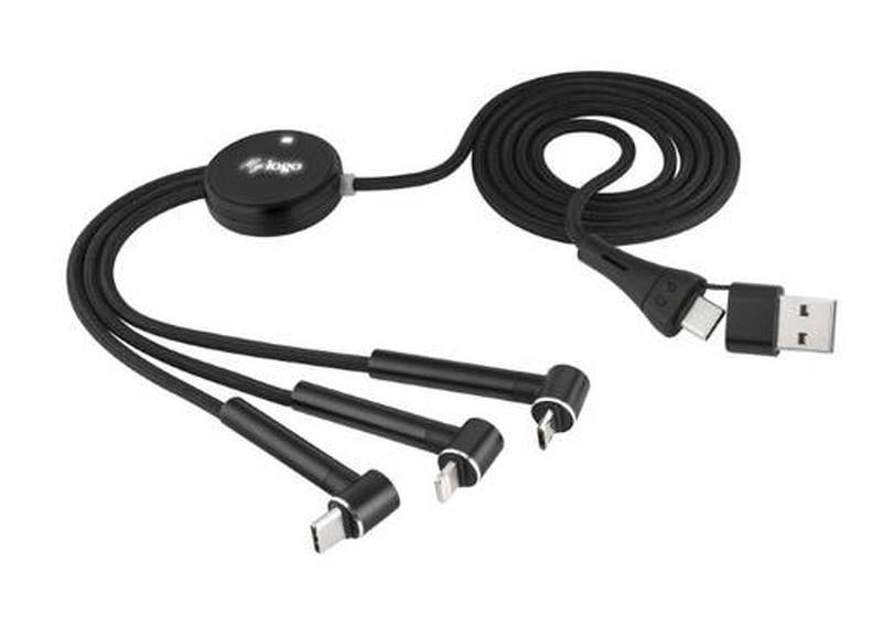 Laadukas latauskaapeli, jossa on monipistokejärjestelmä kaikille matkapuhelimille ja erittäin suuri valaistu XXL-mainostila. 95 cm kaapeli, valaistu logo. 3 sovitinta: USB, Lightning®, USB-C, latauskaapeli. Pakattu kartonkipakkaukseen.