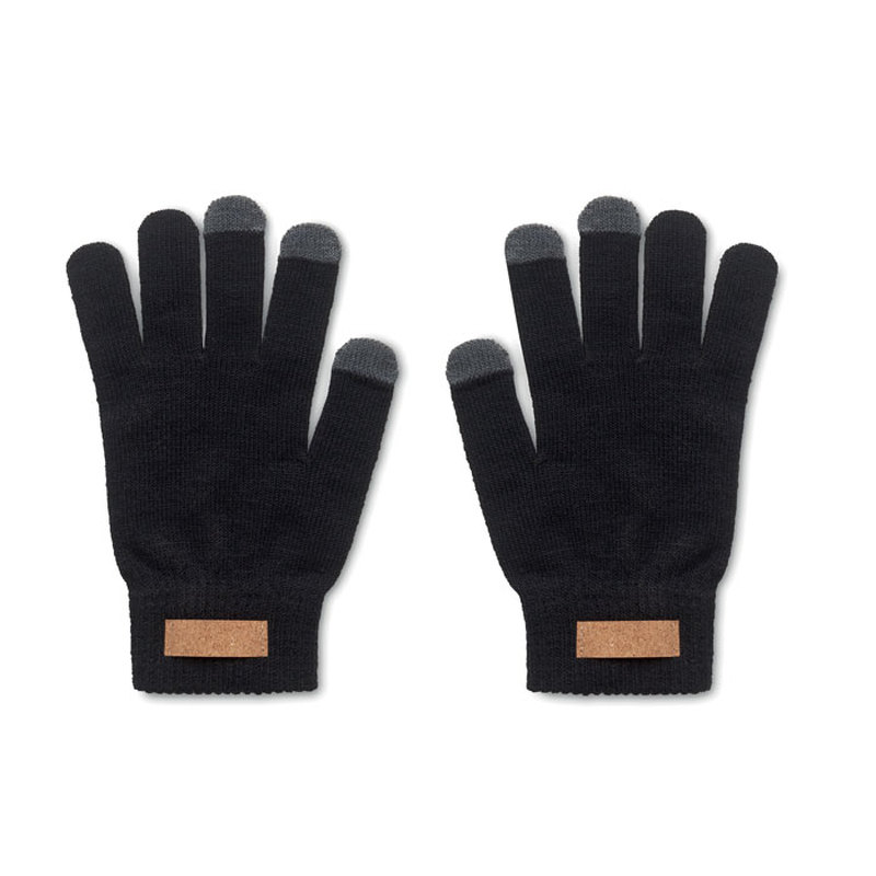 Älypuhelimen kosketusnäyttökäsineet RPET-polyesteriä. Käsineissä on korkkia oleva merkki merkkausta varten.