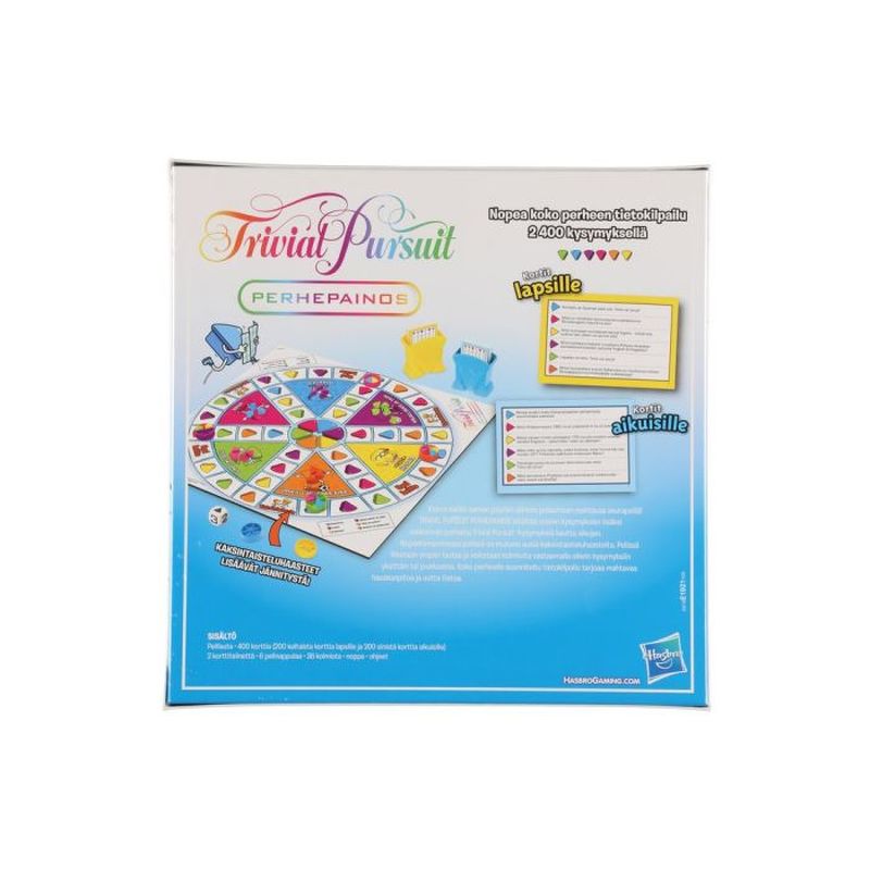 Nopeasti pelattava Trivial Pursuit Perhepainos -peli sisältää 400 korttia, joissa on yhteensä 2400 kysymystä, kahdella erillisellä korttipakalla: yksi lapsille (1200 kysymystä) ja toinen aikuisille (1200 kysymystä). Trivial Pursuit Perhepainos -pelissä on joitain uusia trivia-kysymyksiä ja nopea pelattavuus, mukaan lukien Showdown-haaste, jossa 2 pelaajaa kilpailee piirakkakiilasta samanaikaisesti. Pelaa yksin tai joukkueissa ja vastaa kysymyksiin oikein voittaaksesi kiilat. Perheenjäsenet voivat testata älykkyyttään kysymys toisensa jälkeen kuudessa kategoriassa: maantiede, viihde, historia, urheilu ja vapaa-aika, taide ja kirjallisuus sekä tiede ja luonto. Ole ensimmäinen pelaaja tai joukkue, joka ansaitsee kaikkien kuuden kysymysluokan kiilat ja vastaa viimeiseen kysymykseen oikein voittaaksesi. Sisältää pelilaudan, 400 korttia, joista 200 keltaista korttia lapsille ja 200 sinistä korttia aikuisille, 2 korttipidikettä, 6 pelimerkkiä, 36 kiilaa, 1 noppa ja ohjeet. Pelaajamäärä 2–6 (joukkueet mahdollisia). Ikäsuositus 8+.