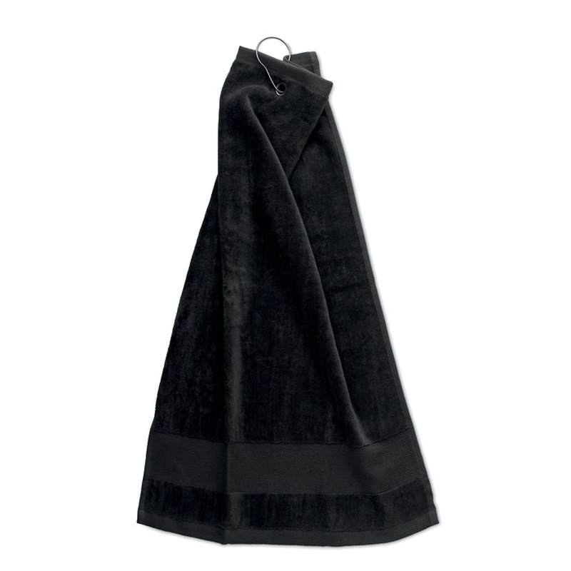 Puuvillainen golfpyyhe, Kuparinen rengas yläosassa, jotta sen voi ripustaa golfbagiin. Pyyhkeen koko: 40 x 60 cm, 350 g/m²..