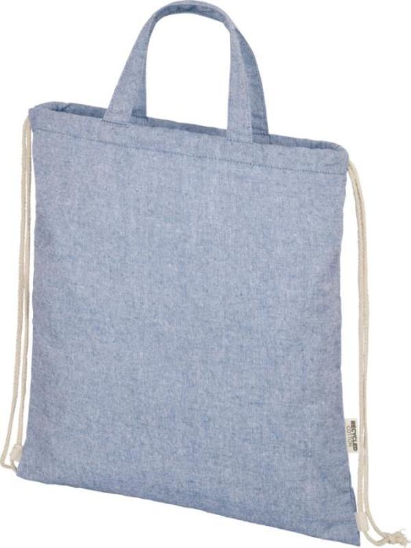 Kierrätetystä 150 g/m²-puuvillapolyesterisekoituksesta valmistettu reppu kiristysnyörillä. Suuri päälokero ja luonnonväriset puuvillaiset kiristysnyörit. Kierrätetty puuvilla valmistetaan valmistusmateriaalin ylijäämästä, jota syntyy tekstiilitehtaissa leikkaamisen aikana. Samankaltaiset värit sekoitetaan yhteen, eli reppua ei tarvitse värjätä erikseen. Kierrätyspuuvillan luonteesta johtuen väreissä voi olla pientä vaihtelua. Repulla on tämän ominaisuuden ansiosta autenttinen ulkonäkö. Jokaisen repun mukana tulee myös Aware™-jäljitin. Tämän innovatiivisen ominaisuuden avulla käyttäjät voivat jäljittää tuotteensa alkuperän ja matkan QR-koodin avulla, mikä lisää läpinäkyvyyttä toimitusketjussa ja edistää vahvempaa yhteyttä tuotteen ja sen tuotantoprosessin välillä. Kestää jopa 5 kg painon. Kahvan pituus: 14 cm. Kierrätetty puuvilla Kierrätetty muovi, 150 g/m2.