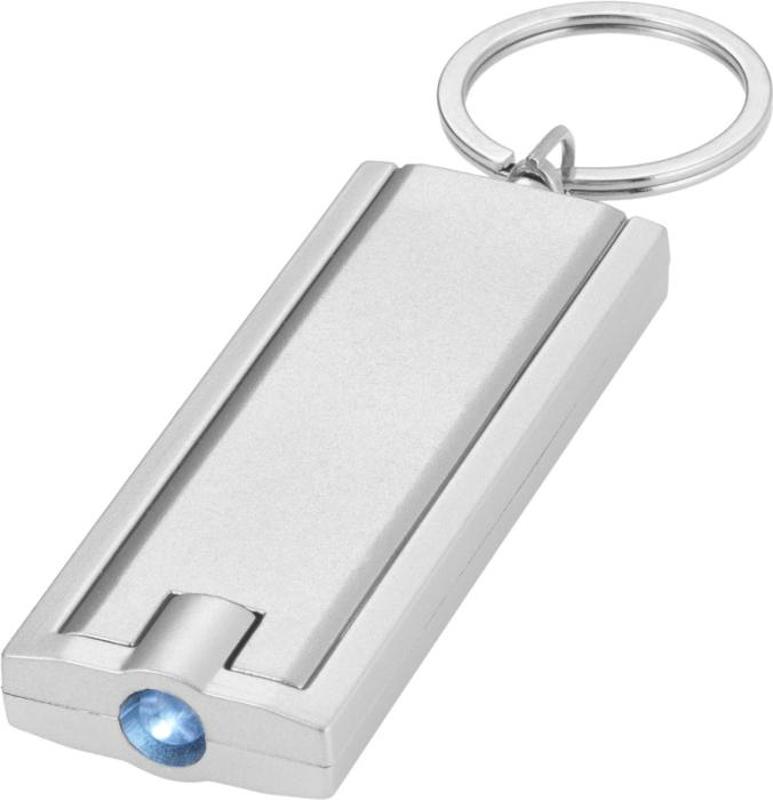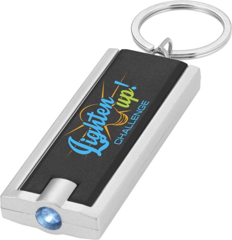 Avainvalo, jossa on kirkas, valkoinen LED-valo ja virtapainike. Metalliavainrengas. Mukana paristot.