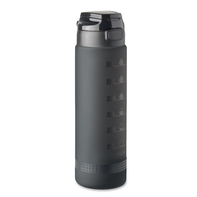Sportti vesipullo RPET-muovia, motivoiva aikamerkintä, yhdellä kädellä avattava kääntyvä kansi, turvalukko ja kantohihna. Vuotamaton. Tilavuus: 1L.