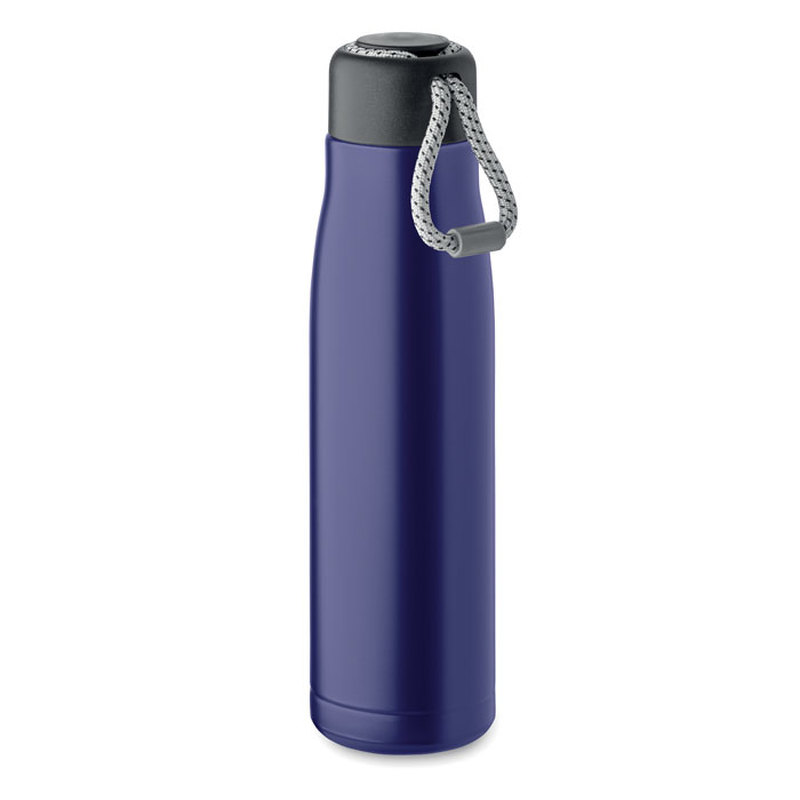 Kaksiseinäinen kierrätetystä ruostumattomasta teräksestä valmistettu eristetty tyhjiöpullo (90 % kierrätettyä ruostumatonta terästä ja 10 % ruostumatonta terästä), jossa on integroitu PP-kannessa oleva kantolenkki. Vuotamaton.