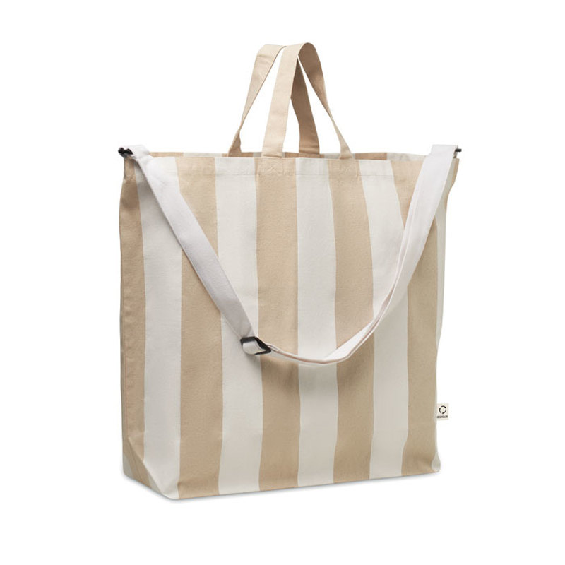 Erittäin suuri raidallinen rantalaukku 280 gr/m² kierrätyspuuvillasta (80 %) ja kierrätyspolyesteristä (20 %), jossa on sisätasku. Lyhyet kahvat ja yksi suuri säädettävä olkahihna.