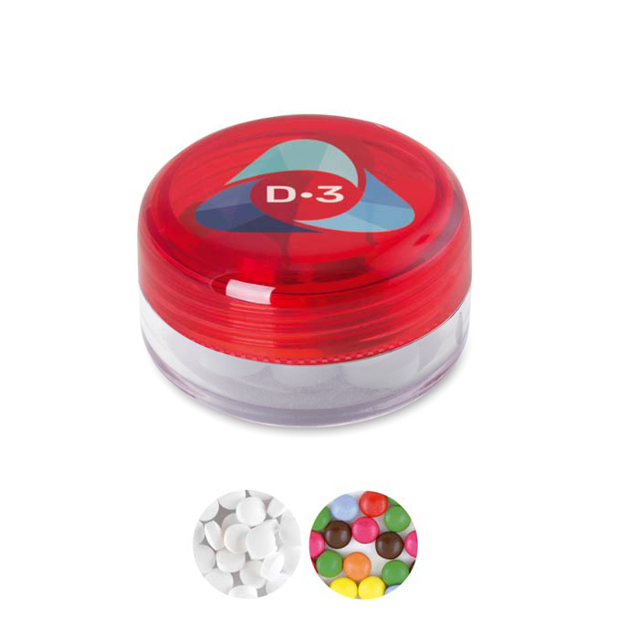 Pyöreä muovirasia, jossa on minttupastilleja tai makeisia.