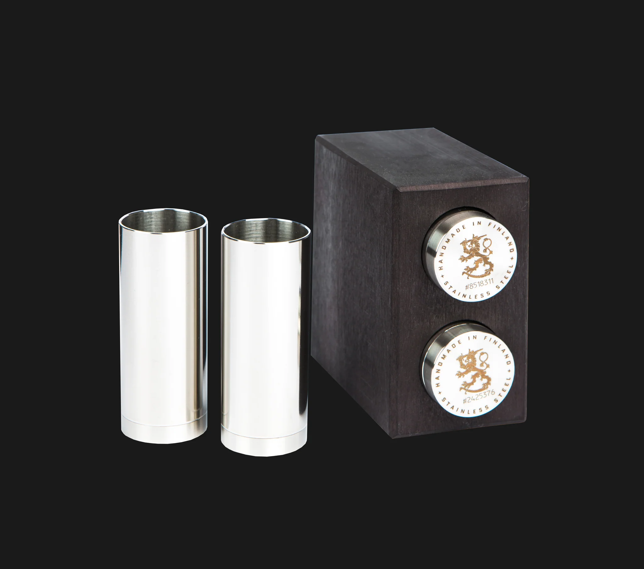 Ukko Schnapps 2 Leijona Musta koivukuutio sisältää kaksi ruostumattomasta teräksestä valmistettua snapsilasia. Tarjoa pakkaskylmät snapsit tyylikkäästi tai anna lahjana.