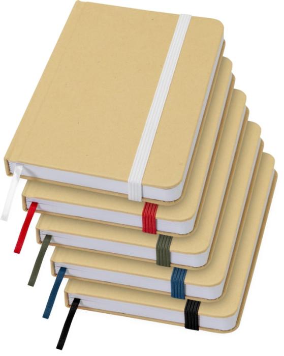 A5-kokoinen viivoitettu muistikirja kynällä, kierrätyspahvia.