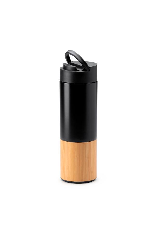 S4211Coiba termospullo Thermal 304 ruostumattomasta teräksestä valmistettu kaksiseinäinen pullo, jossa bambuyksityiskohtia. Ihanteellinen pullo pitää juomat kylmänä ja kuumana. Kansi kahvan tukitoiminnolla, joka toimii samalla puhelimen jalustana. Tilavuus 450 ml.Coiba termospullo