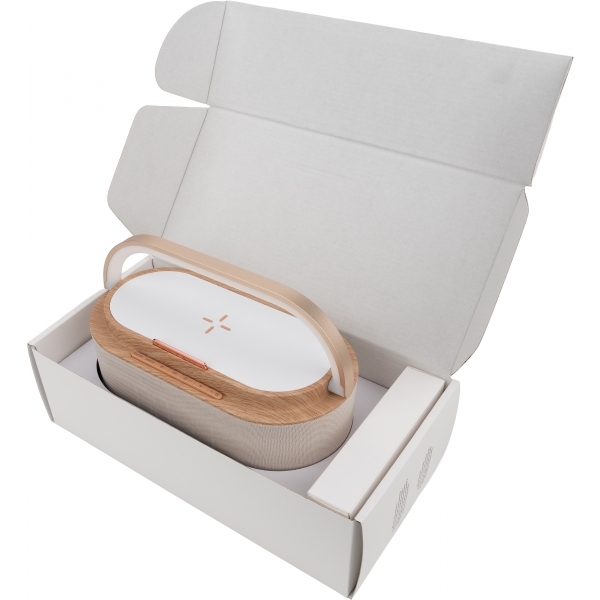 Bluetooth kaiutin LIMASSOL Bluetooth-kaiutin, jossa on sisäänrakennettu langaton latausalusta, digitaalinen näyttö, 2000 mAh akku, radio, herätyskello, puhelinteline sekä lamppu, jossa on kolme kirkkaustasoa.