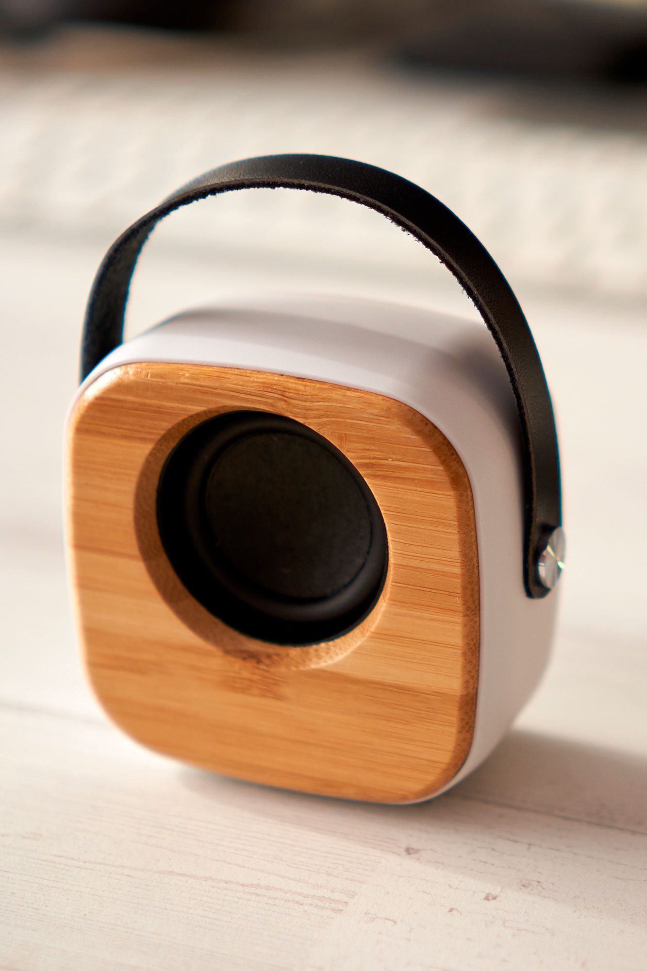 Alesso langaton kauitin Langaton Bluetooth-kaiutin, jossa ABS-runko, luonnollinen bambuetuosa ja näkyvä kartio. Mukana keinonahkainen kahva. 3W lähtö. Ladattava akku. Kaapeli mukana.