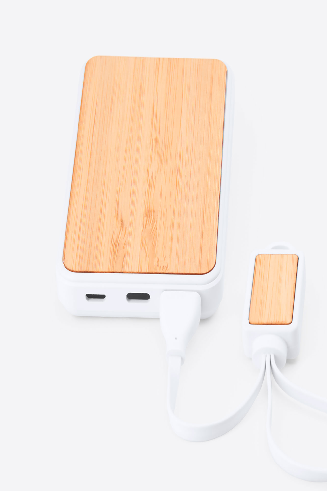 Possum power bank 5 000 mAh akkupankki, jossa valkoinen ABS-runko ja bambusta valmistettu yläpinta. USB DC5V / 2.1A lähtö. Mukana Micro USB kaapeli.