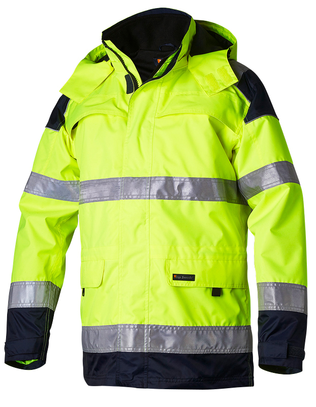 BLÅKLÄDER HIGHVIS KUORITAKKI Hengittävä, tuulen- ja vedenpitävä kuoritakki teipatuilla saumoilla. Täydellinen valinta kylmää, sadetta ja tuulta vastaan. Materiaali on kevyt ja helppohoitoinen ja se sopii erinomaisesti työhön, jossa takilta vaaditaan paljon. Sertifioitu EN ISO 20471 luokka 3, koot XS-S luokka 2 ja EN 343 Luokka 4,4.