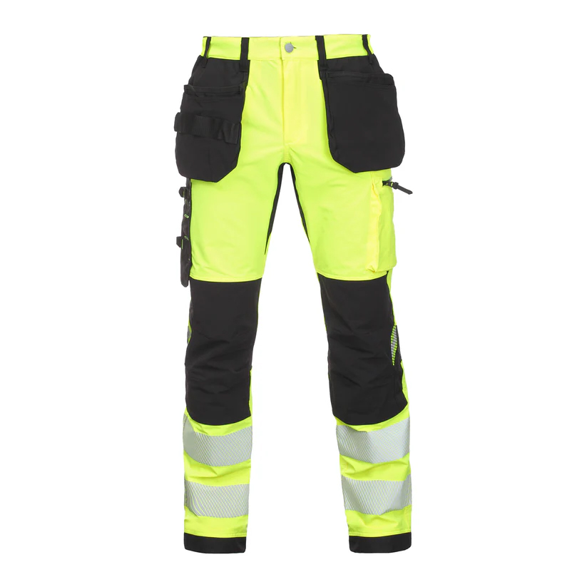 Blåkläder Highvis housut 4-way strech Mukavat ja toiminnalliset highvis housut 4 suuntaan joustavasta materiaalista. Lahkeet on kapenevat ja erittäin mukavat joustavan ja pehmeän kankaan ansiosta. Housuissa on toiminnalliset taskut vahvistuksilla, vetoketjullinen paljereisitasku, mittatasku, etutaskut ja takataskut. Polvisuojataskut on vahvistettu joustavalla CORDURA®-kankaalla ulkopuolelta ja sisäpuoli on stretch-kangasta liikkuvuuden ja mukavuuden lisäämiseksi. Joustava verkkokangas polvitaipeissa lisää hengittävyyttä. Lahkeensuut on vahvistettu takapuolelta kulumisen estämiseksi. Sertifioitu EN ISO 20471 luokka 2.