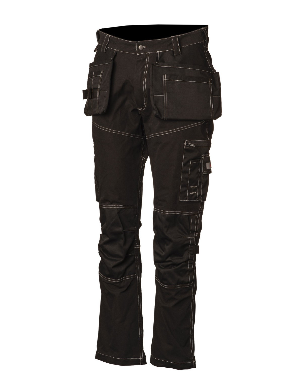 Etutaskut, reisitasku, esiinotettava vaaka/pysty henkilökorttitasku vasemman reisitaskun sisällä. Mitta/hitsauspuikkotasku, takatasku ja vahvistetut polvisuojataskut. Vasaralenkki ja puukkonappi. Jatkovara 4 cm.