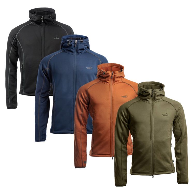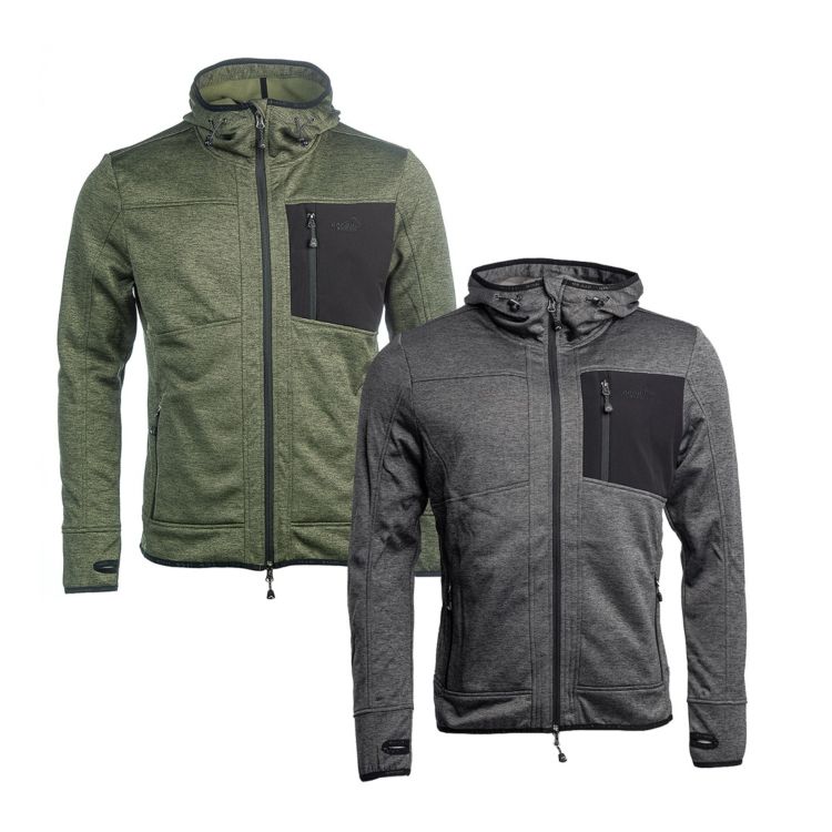 Wildlife Hood Men Wildlife hood on ohut ja joustava hupullinen takki, jossa harjattu fleecepuoli. Toimii hyvin kaksikerroksisena vaatteena. Kaksisuuntainen vetoketju edessä ja rintatasku sekä vetoketjulliset käsitaskut. Takana käytännöllinen takatasku. Peukalokahva hihassa. Paino koossa L 616g.