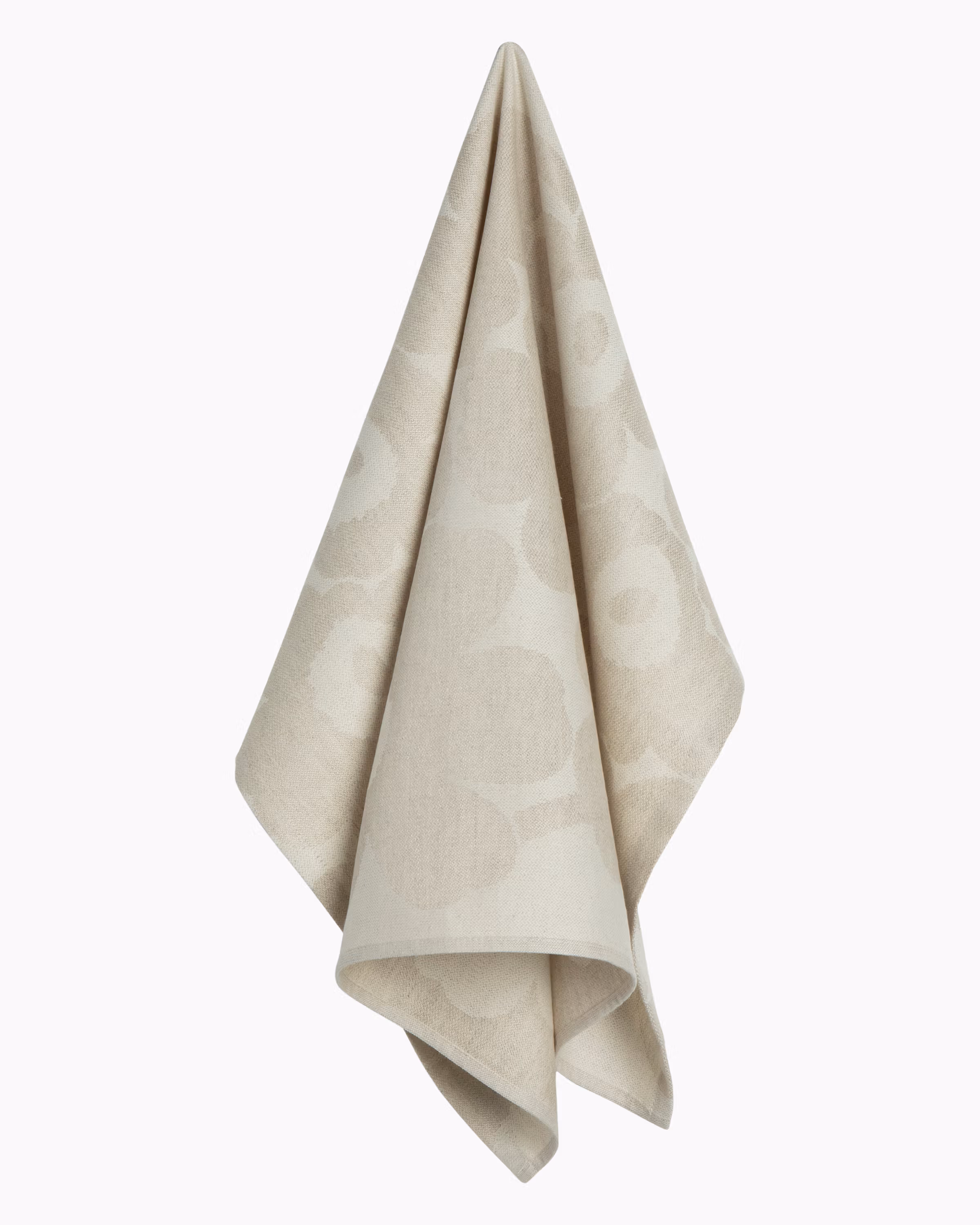 070515Marimekko Pieni Unikko -keittiöpyyhe 50x70cm Ryhdikkäästä puuvillapellavasta valmistetussa keittiöpyyhkeessä on jacquard-neuloksella tehty luonnonvalkoisen ja beigen sävyinen Pieni Unikko –kuosi. Pyyhkeessä on ripustuslenkki.